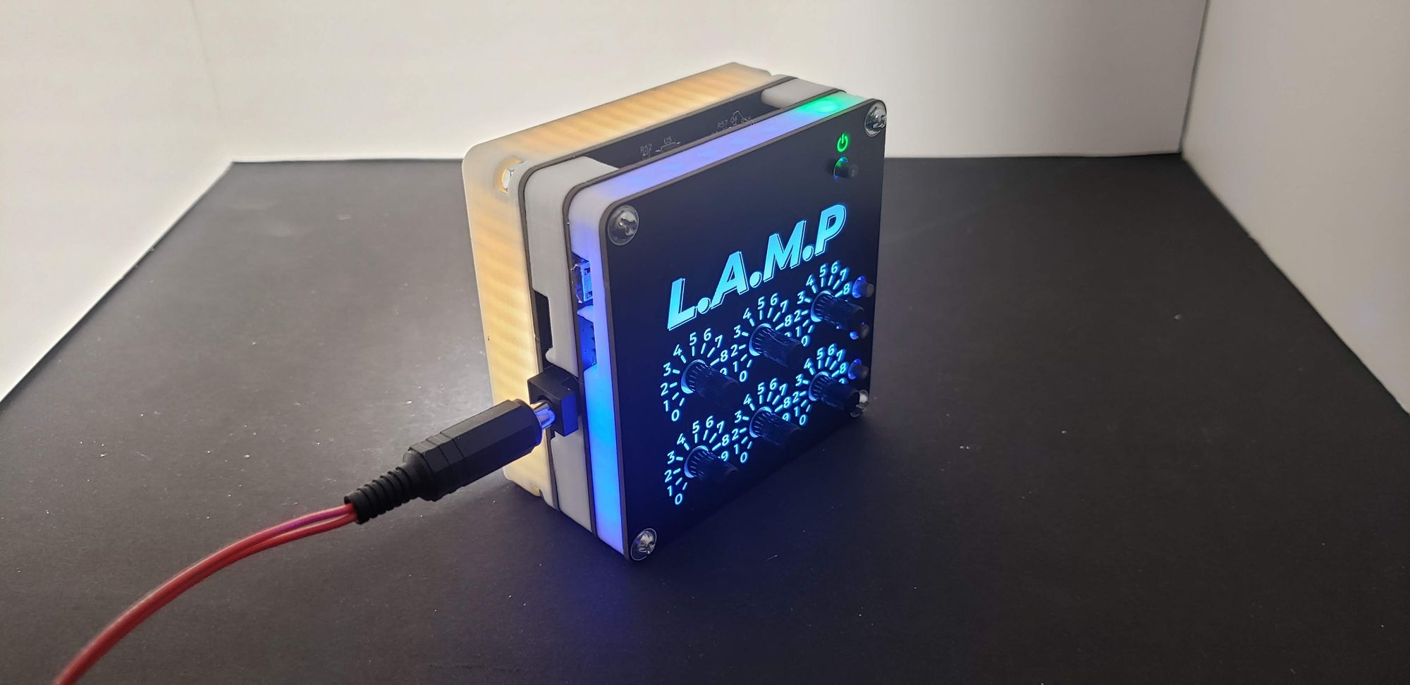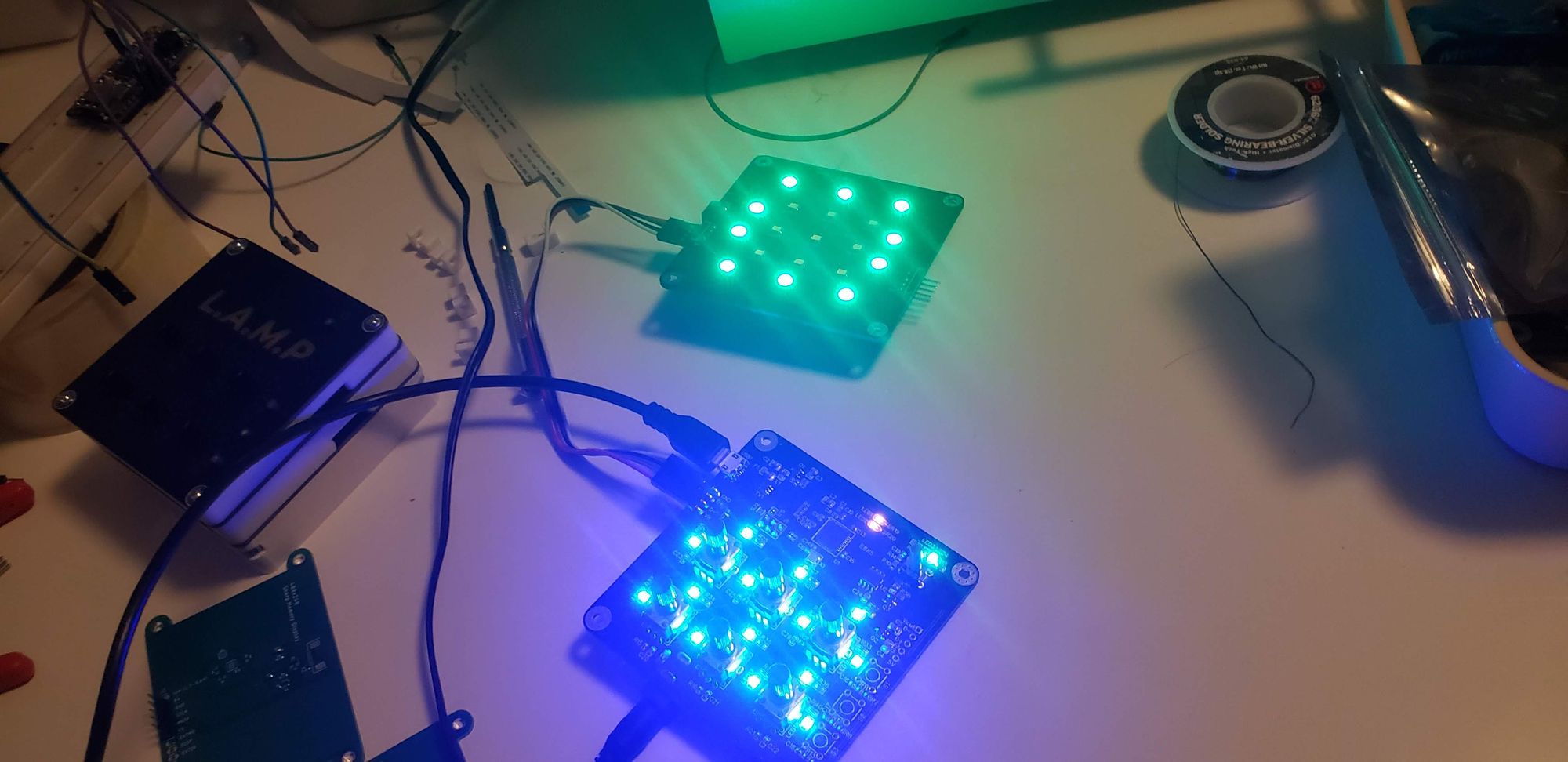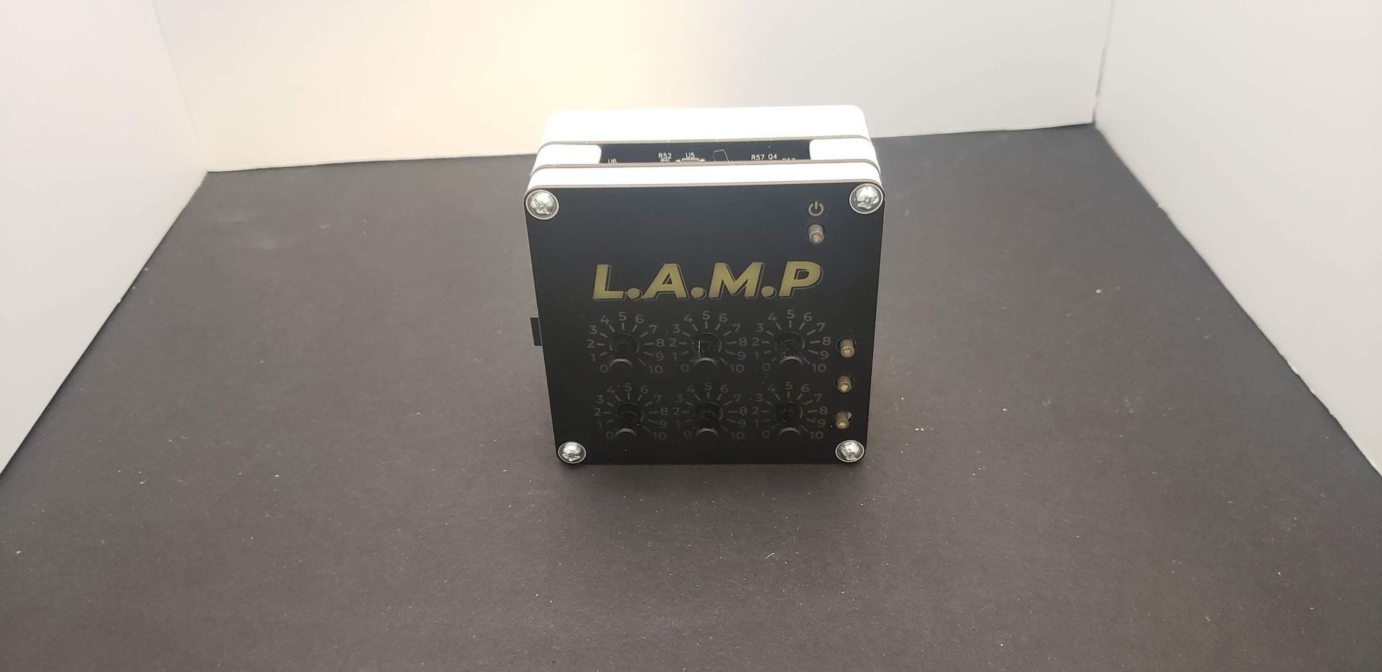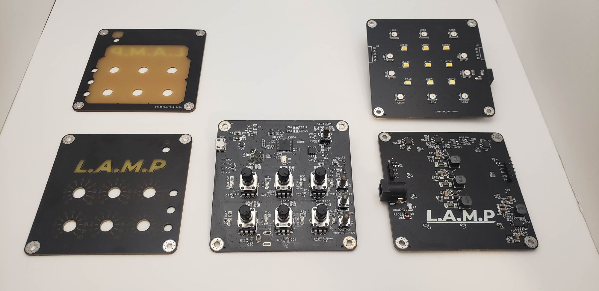 L.A.M.P. is constructed from 3 PCBs: the front panel PCB, controller PCB, and the LED panel PCB.