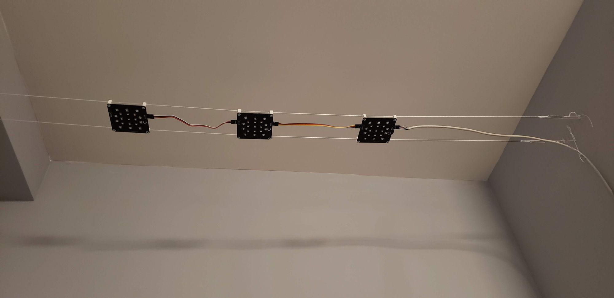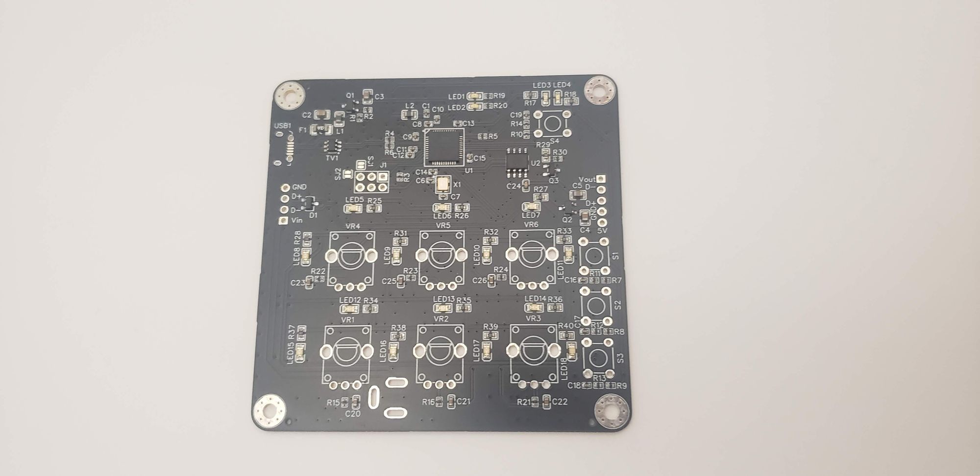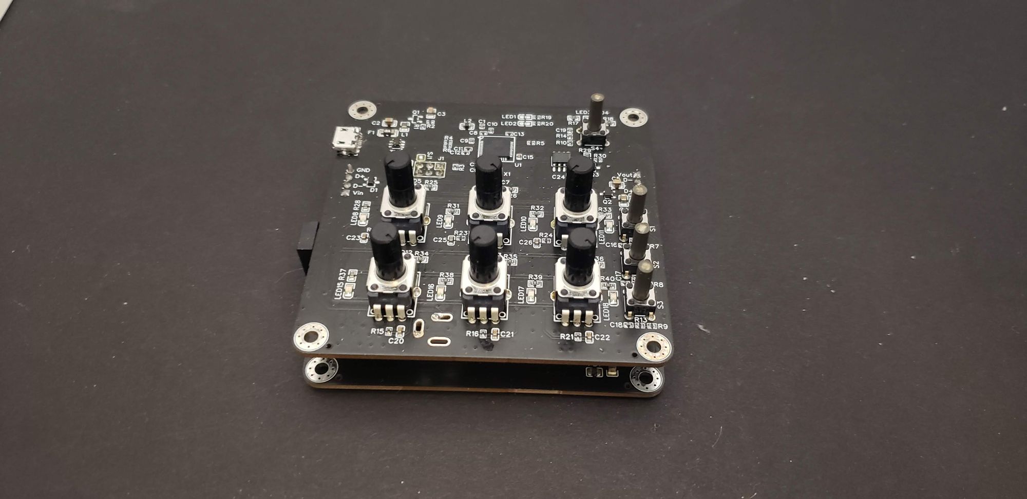 The controller PCB (below) has knobs and buttons for controlling the device. The state of these inputs is read by a microcontroller (Atmega32u4) which updates the color values to the LED panel/panels. This board also has USB connectivity for programming and communication.
