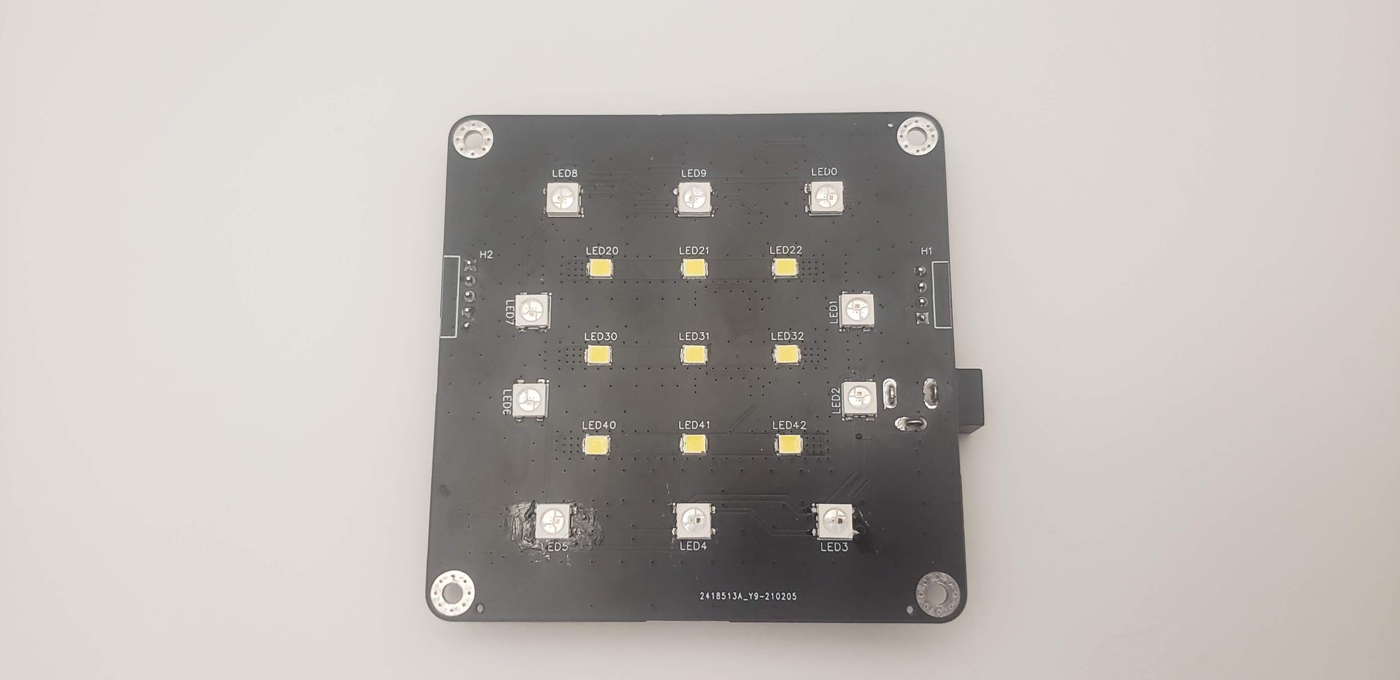 The LED panel (below) receives signals from the controller to determine the brightness of each LED. It uses a buck type LED driver for each white LED color channel. For the RGB LEDs, WS2012 LEDs are used. These run on 5V so an additional buck converter is used to regulate the input supply to this voltage. Multiple of these panels can be chained together to make an array of individually addressable light sources.